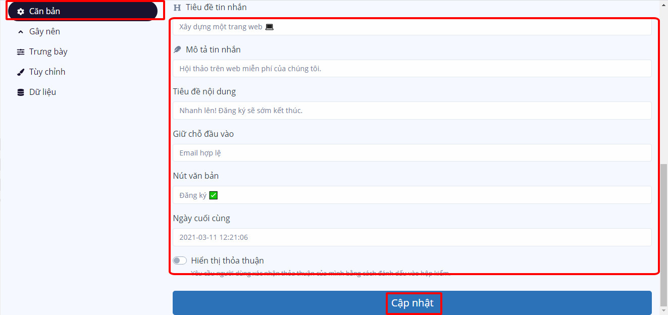 - Bấm chọn module Căn bản > điền đầy đủ thông tin > bật/ tắt chế độ Hiển thị thỏa thuận > bấm vào nút Cập nhật.