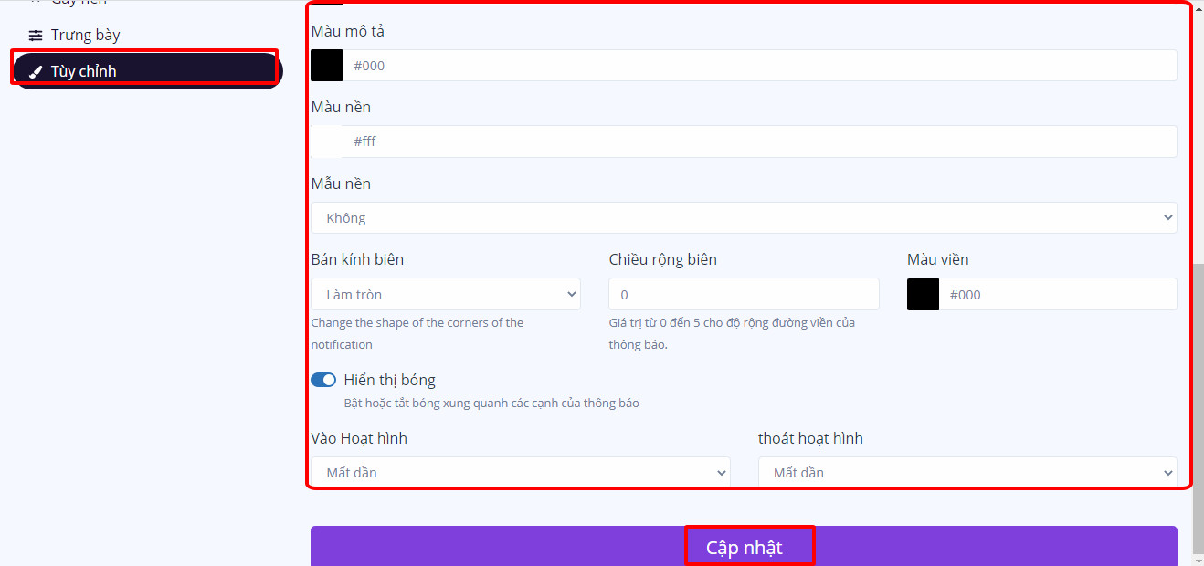 - Bấm chọn phần Tùy chỉnh > điền đầy đủ thông tin > chọn 1 module theo danh sách đã có sẵn > bật chế độ hiển thị bóng > bấm chọn Cập nhật.