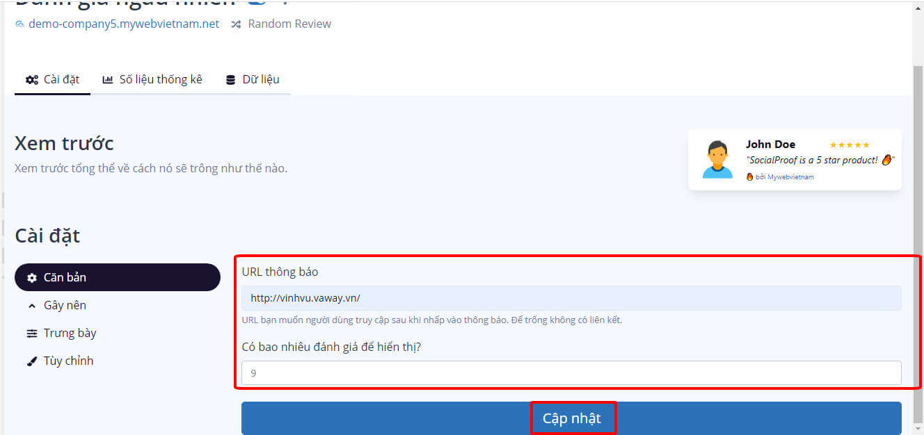 - Các mục: Căn bản, Gây nên, Tùy chình, Dữ liệu, Trưng bày thì quý khách không nhất thiết phải điền hết tất cả các mục này. Khi đó, tiện ích vẫn hiển thị được ra ngoài trang chủ.