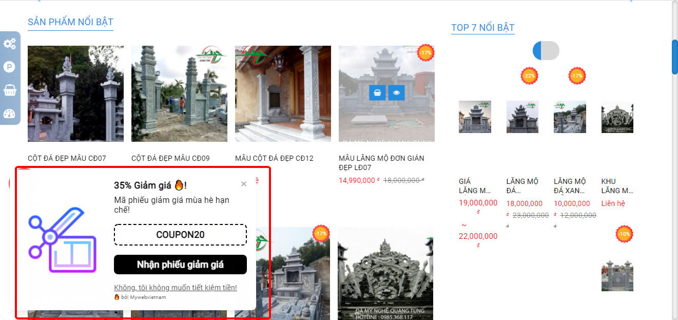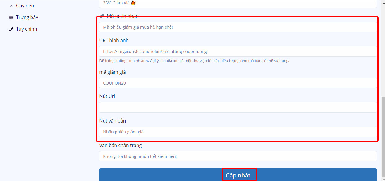- Lưu ý: Để hiểu thêm về các thông số của tiện ích, xin mời quý khách tham khảo bài viết Giải thích các thông số trong các tiện ích của công cụ marketing tool của chúng tôi.