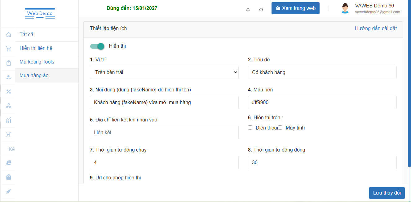 - Kích hoạt chế độ hiển thị > điền thông tin cho tiện ích > bấm chọn Lưu thay đổi.