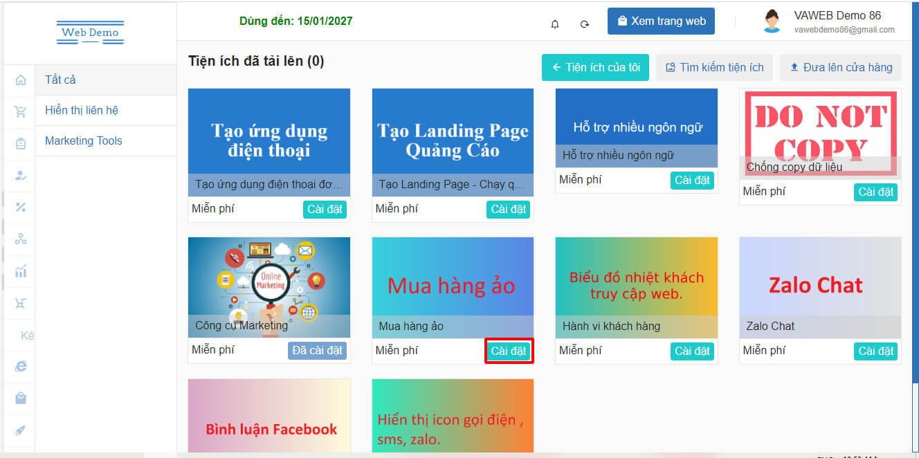- Chọn tiện ích mua hàng ảo > Bấm Cài đặt.