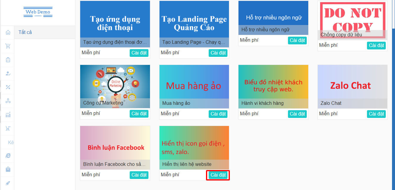- Chọn tiện ích Hiển thị liên hệ website > Cài đặt.