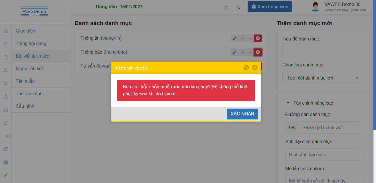 - Chọn vào icon biểu tượng xóa bên cạnh danh mục.