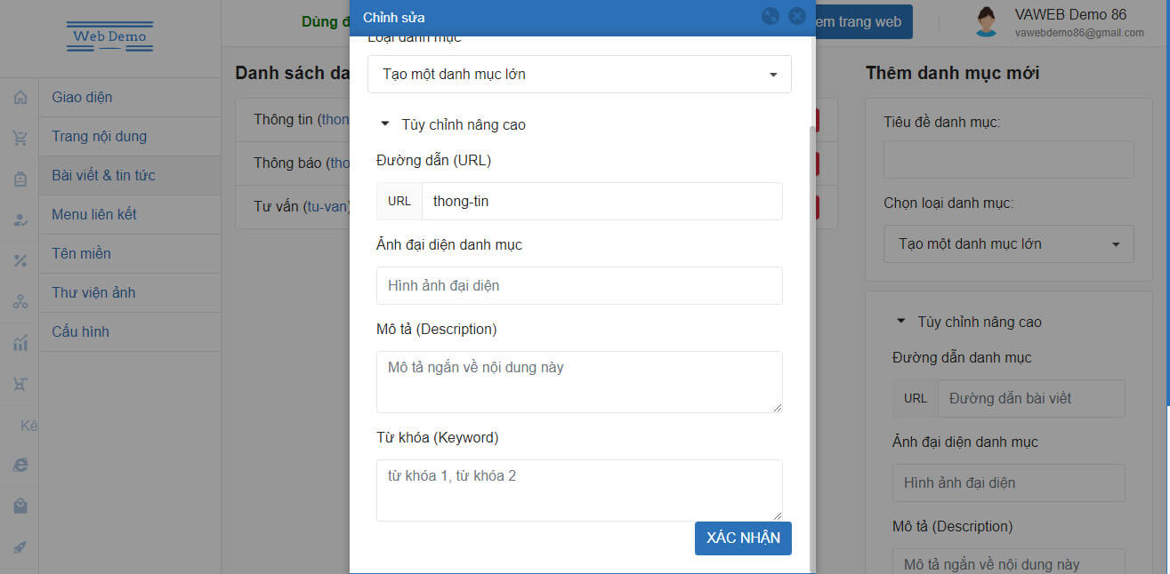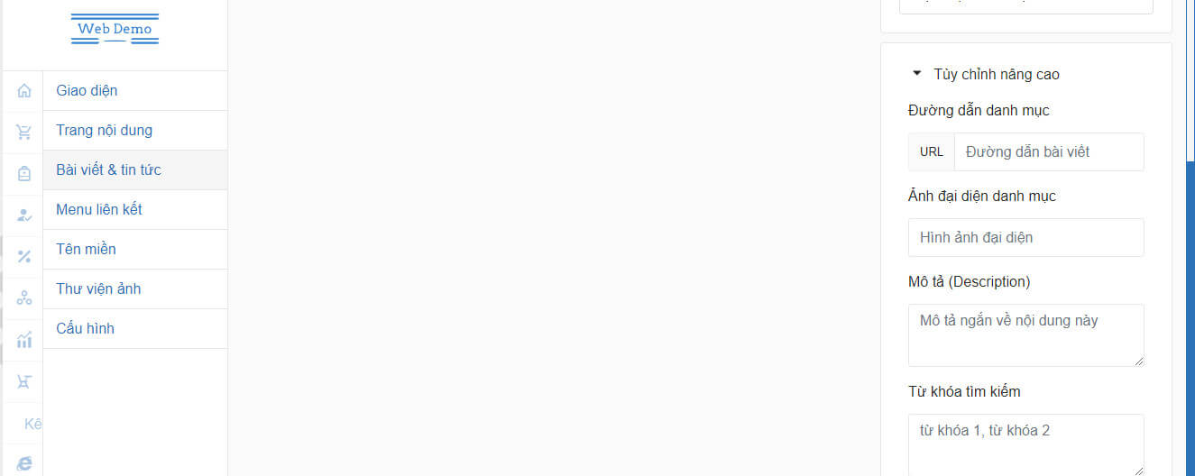 - Với danh mục mới ta chọn Tuỳ chỉnh nâng cao và điền các thông số.