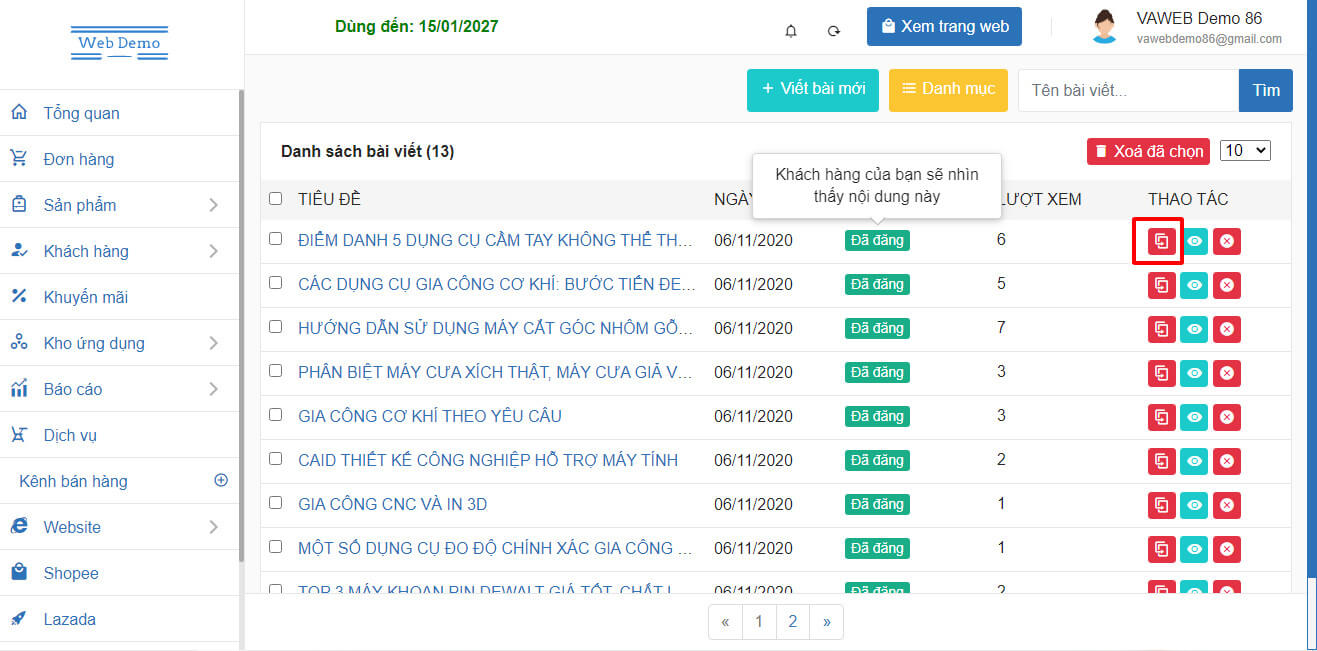 - Bấm vào biểu tượng nhân bản bên cạnh bài viết muốn nhân bản.
